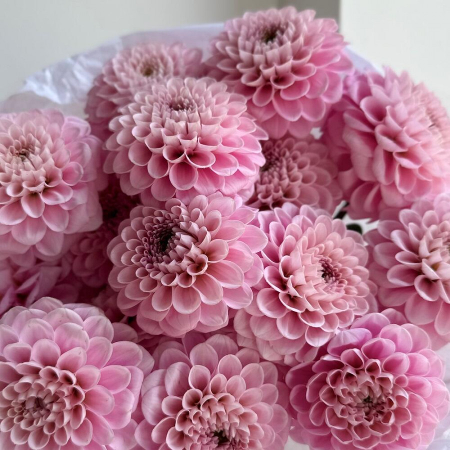 На фото букет из 15 розовых георгин. В составе: георгина 15 шт, дизайнерская упаковка 2 шт, атласная лента 1 шт, . Все цветы свежие и ароматные, букет красиво оформлен и отлично подходит для подарка. Доступна доставка цветов или самовывоз.