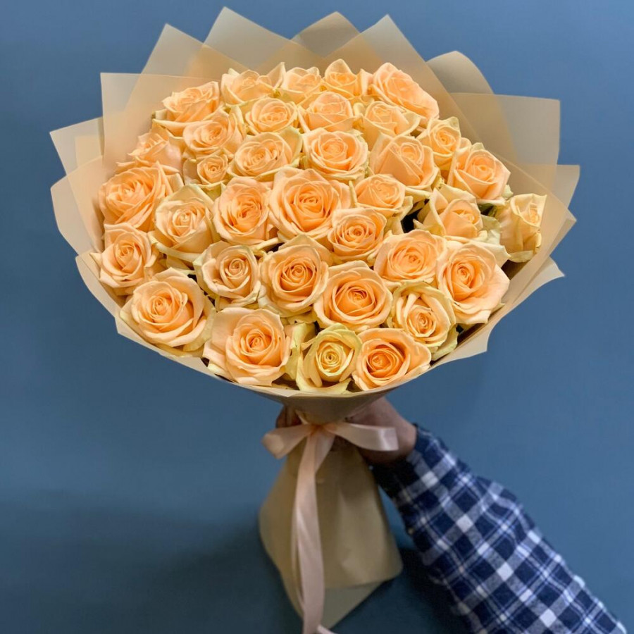 На фото букет из 35 кремовых роз. В составе: роза 35 шт, дизайнерская упаковка 2 шт, атласная лента 1 шт, . Все цветы свежие и ароматные, букет красиво оформлен и отлично подходит для подарка. Доступна доставка цветов или самовывоз.