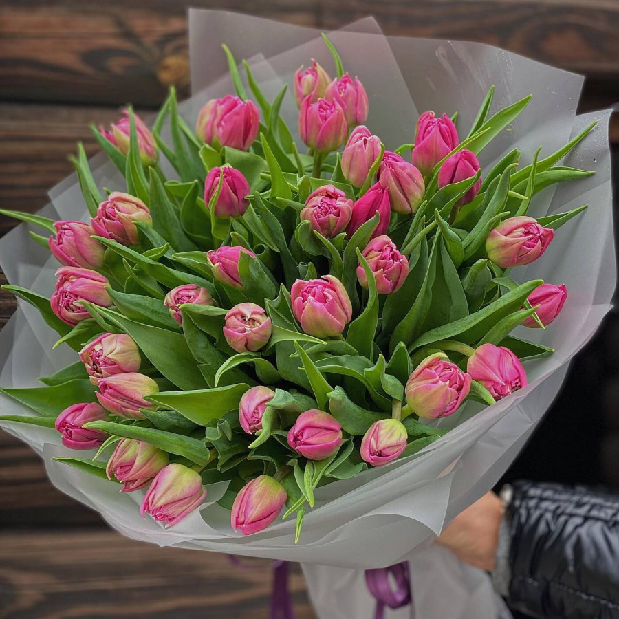 На фото букет из 31 розового пионовидного тюльпана. В составе: тюльпан пионовидный 31 шт, крафт-бумага 1 шт, атласная лента 1 шт, . Все цветы свежие и ароматные, букет красиво оформлен и отлично подходит для подарка. Доступна доставка цветов или самовывоз.