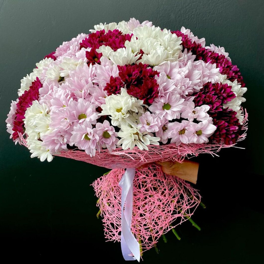 На фото букет из 35 розовых хризантем. В составе: хризантема кустовая 35 шт, . Все цветы свежие и ароматные, букет красиво оформлен и отлично подходит для подарка. Доступна доставка цветов или самовывоз.