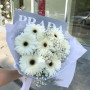 На фото букет из белых гербер и гипсофилы. В составе: гербера 7 шт, гипсофила 2 шт, крафт-бумага 1 шт, атласная лента 1 шт, . Все цветы свежие и ароматные, букет красиво оформлен и отлично подходит для подарка. Доступна доставка цветов или самовывоз.