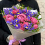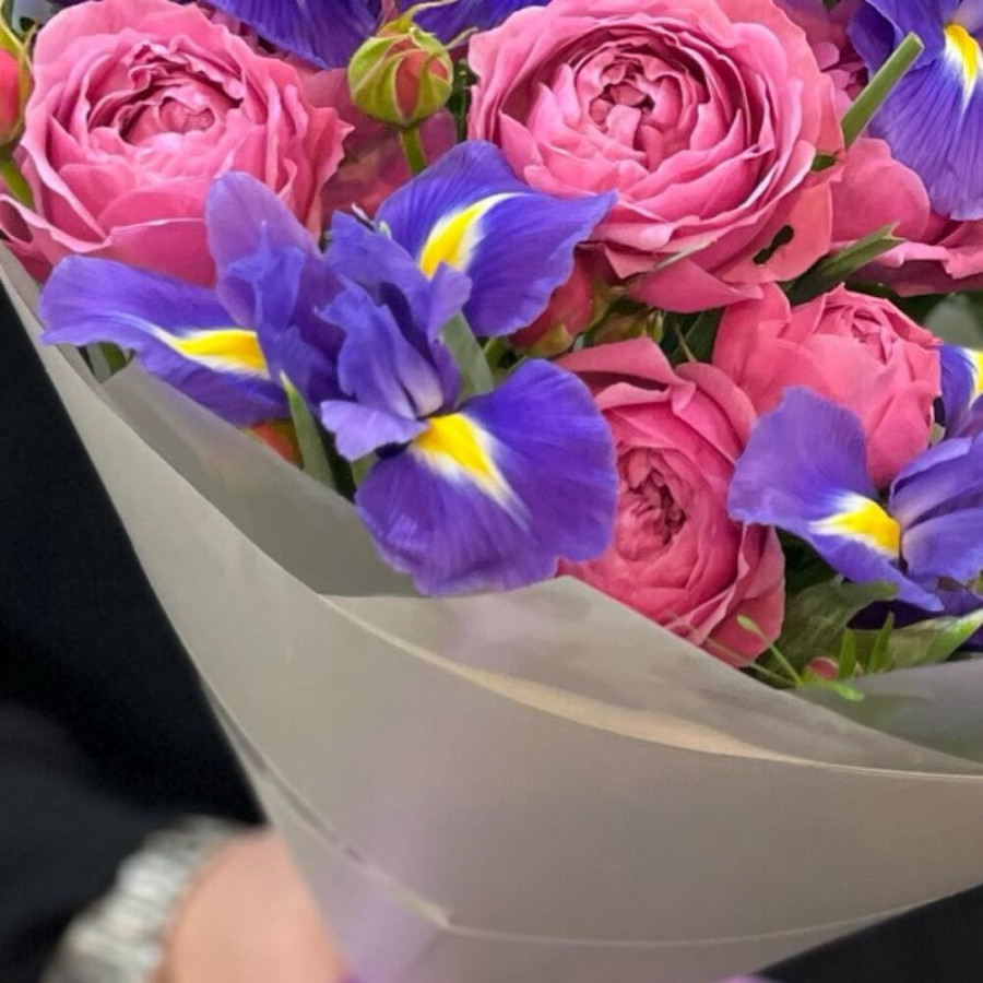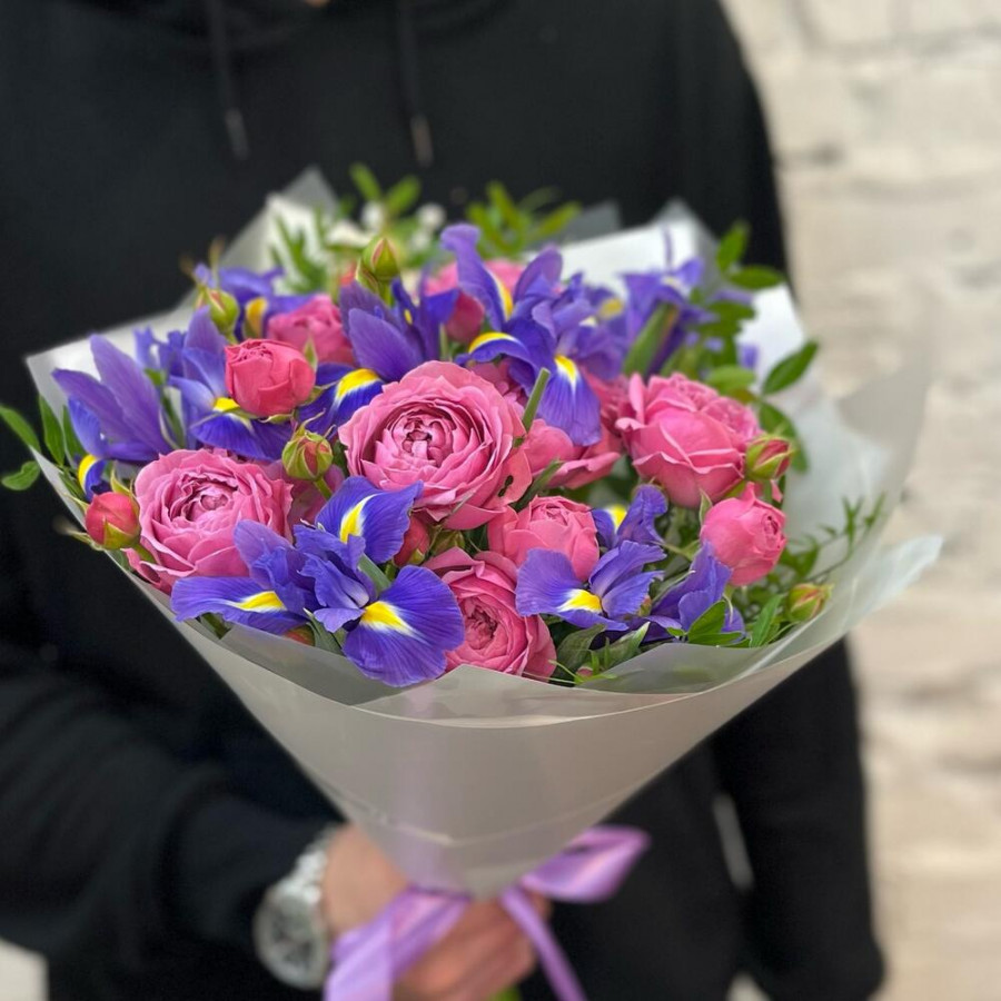Букет из розовых пионовидных роз и синих ирисов в Лесном