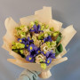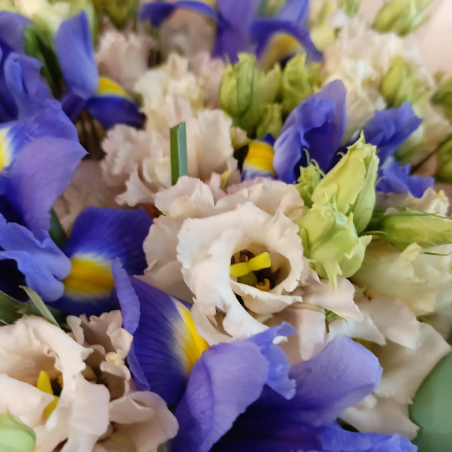 Букет из синих ирисов и кремовых эустом в Лесном